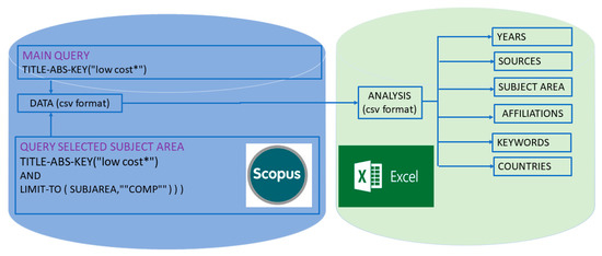 In order to carry out this work, a bibliometric study has been carried out by consulting the Scopus database with the following search string TITLE-ABS-KEY (“low cost”), and, as will be seen below for the analysis by subfields, the specific searches have been limited to the indexation categories of Scopus, as for example for the Computer Science field, the search term was: (TITLE-ABS-KEY(“low cost”) AND (LIMIT-TO (“SUBJAREA,”“COMP”))). Figure 1 shows the methodology applied in this research, the main search is done in the Scopus database and the data analysis in Excel. Note that it has also been tested with the term “low-cost”, and the results were not different. In mathematics, it draws attention because a priori it did not seem a term of scientific importance here, so that this discipline uses low cost at the same level as other categories such as the energy category, since this term is linked to the economy. Regarding the category of medicine, it is also noteworthy that low-cost solutions are sought from the point of view of research. The reasons for this will be discussed later.