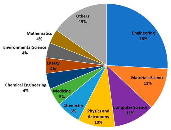 Table 9 shows the main keywords in categories 4 to 6, Physics and Astronomy, Chemistry, and Medicine. Then, for the Physics and Astronomy category, it was found again that the subject of sensors is the main keyword. Followed in second and third place by Substrates, and Thin Films. In fourth place appears the Scanning Electron Microscopy. One could say that it is very similar to the category of materials, changing very little the order of the main keywords. Then, it can be concluded that there is a high degree of research in the field of physics oriented to the science of materials. The most cited work in the category of Physics and Astronomy is “A consistent and accurate ab initio parametrization of density functional dispersion correction (DFT-D) for the 94 elements H-Pu” [36]. Related to cost effectiveness, following manuscript is worth highlighting “TiO 2 photocatalysis: A historical overview and future prospects” [37].