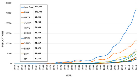 The results show that the global trend towards research into low-cost technologies is increasing exponentially, especially since 2000. As expected, the engineering category is the one that has always led the way in the number of scientific publications. With respect to the other scientific categories, there was a period, between 2006 and 2014, that the computer science category was undoubtedly the second. In the last year with full data, 2018, however, the categories of Mathematics, computer science, and Physics and Astronomy are very close.