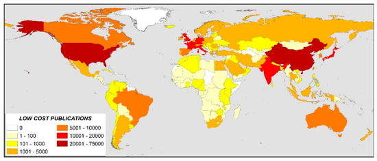 Table 1 shows the top 30 countries with the most low-cost publications and calculates the ratio per million inhabitants. It shows how the Asian countries, Singapore and Hong Kong, occupy the top positions together with Switzerland in third position and Australia in fourth position. Regarding the countries with more than 200 million people, the USA leads the ranking with a ratio above 200, while Brazil and China are around 43 and 40, respectively, and finally China with a ratio around 13.