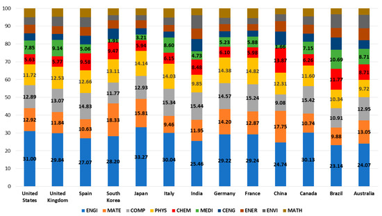 Therefore, it can be concluded that the distribution with scientific areas shows that in general the countries have a similar percentage distribution in all areas, see Figure 6. The efforts are not polarized in function of the scientific field, but it is a constant and transversal bet in all the areas of knowledge affected.