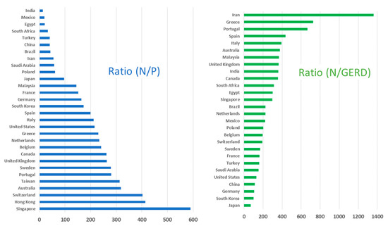 About publications in terms of total investment in research, Gross domestic expenditure on R&D (GERD), Iran stands out in the first position, perhaps because of its current particular commercial relationship with the rest of the world. This rank is followed by European Union countries in this order: Greece, Portugal, Spain, and Italy. These are countries with a high level of technological education and expertise but with more limited research resources, and their researchers are proportionally paying attention to low-cost technologies. Regarding the countries with more than 200 million people, India leads the ranking with a ratio above 360, while Brazil and Mexico are around 226 and 221, respectively, and finally, the USA and China are around 130 and 113, respectively.