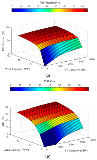 The technical parameters of different PV/wind hybrid system sizes in Gwanda: (a) renewable energy systems (RES) fraction and (b) demand supply fraction.