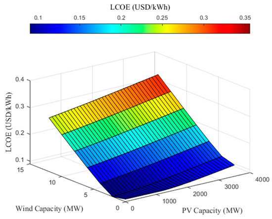 The levelized cost of electricity (LCOE) of different PV/wind hybrid system sizes in Gwanda.