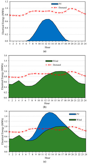 The average hourly energy generation from the maximum feasible: (a) PV system, (b) wind system and (c) PV-wind hybrid system in addition to the average hourly demand of Gwanda.