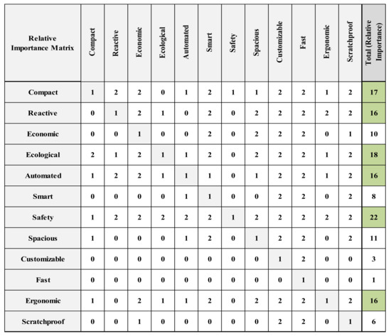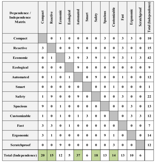 In particular, it is necessary to find the most important characteristics, through the Relative Importance Matrix (Figure 8) and the most independent characteristics through the Dependence/Independence Matrix (Figure 7). Green squares represents the most independent characteristics; grey squares instead are on the diagonal; here, it is not possible to insert values because each characteristic cannot be dependent or independent versus itself.