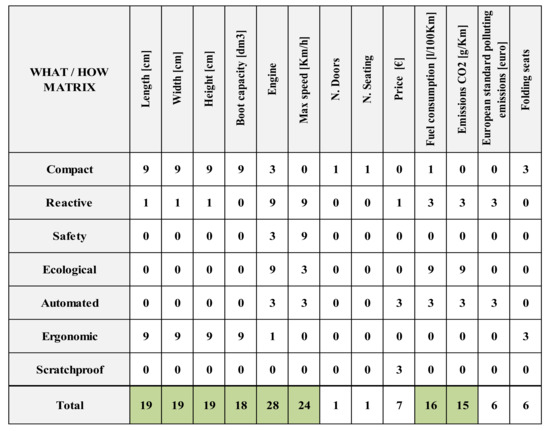 To build the Dependency/Independence Matrix, the main requirements that the product must have and which have been identified through the six QFD questions are reported in the rows and columns of a matrix. The cause and effect relationships between the various requirements are then determined, i.e., the dependency and independence relationships, considering as input each column element (CAUSE) and as output the corresponding element of the row (EFFECT). These relationships are then estimated through a scale of values equal to 0, 1, 3, and 9 (depending on whether the relationship is null, weak, medium or strong). To build the Matrix of Relative Importance, proceed as in the previous case, reporting in the rows and columns of a matrix the main requirements that the product must have and which have been identified through the six QFD questions. The relative importance (relative weight) of each requirement is then determined, with respect to each other, and based on it the values 0, 1, and 2 are attributed (depending on whether the row element has importance minor, same importance or major importance, of the element in the column). Ultimately, the most independent characteristics and those with higher relative importance will be the technical characteristics on which to focus for the development of a new car (they are the ones that have achieved the highest score within the matrix).