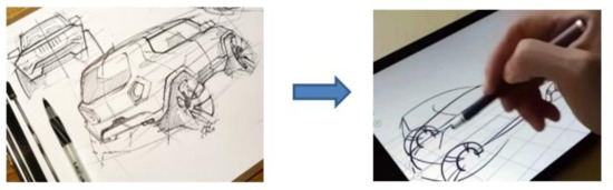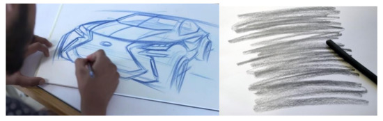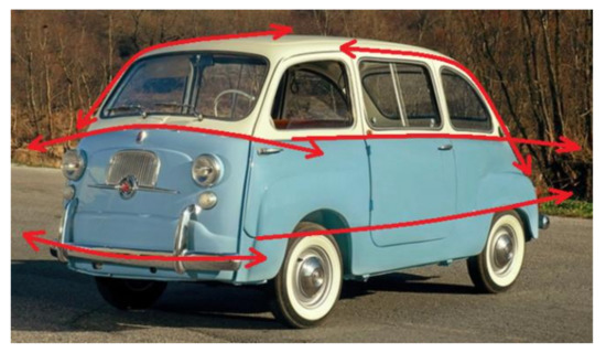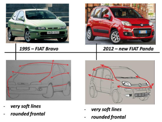 The work begins with the study of corporate stylistic trends. It is one of the most important phases of the whole process, because its bad or partial success will irreparably damage all the phases that will follow in the design process. The study is conducted taking into consideration the stylistic path of the car company of the model it intends to develop, the key moments both positive and negative and which act as a guiding thread in its evolution, and in general all the steps that have led to conceive your “corporate style” to the present day. In this first phase, the second phase of the study (that of the sketches) can be partially anticipated (Figure 12). Red arrows are the styling lines, the ones that characterizes the new shapes.