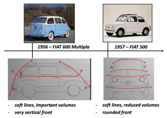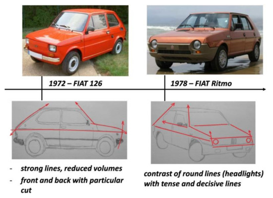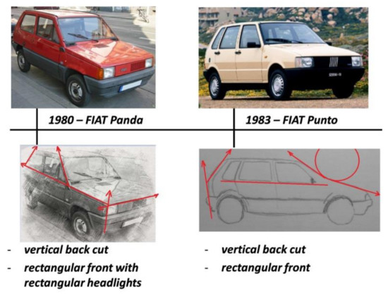 In fact, during the analysis of the style of the cars considered historic and most important for the car company, it is useful to redesign these models by making sketches with different views and paying particular attention to the lines and elements that made them significant. In Figure 13, Figure 14, Figure 15 and Figure 16, the stylistic evolution of FIAT car models was described and the most significant lines and features were highlighted.