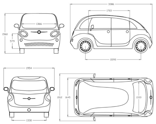 - Bondioli, A. Disegno e Metodi di Progettazione Industriale a Una Vettura Elettrica Innovativa. Master’s Thesis, Università di Bologna, Bologna, Italy, 2015. [Google Scholar]