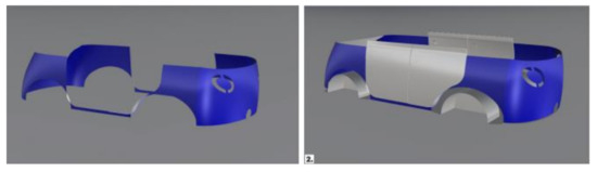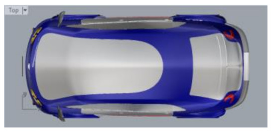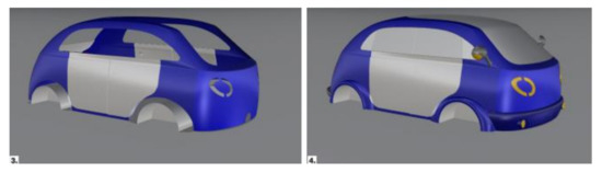 Also in this case, therefore, the 3D model will undergo different transformations (iterative process), both to restore the right proportions, and to make clear the style concepts born in the sketch phase and that are often lost in the rigorous phases of 2D drawings. In this phase, the model is also detailed, with increasingly refined shapes: body side panels (Figure 26), upper part of car body (Figure 27), car roof (Figure 28), complete car in its side and front view (Figure 29), front rendering (Figure 30), side and back rendering (Figure 31).