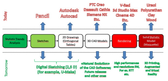 In addition, as seen in paragraph “4.Future Developments”, new development perspectives were provided for Stylistic Design Engineering (SDE). It means that all the SDE phases can be oriented to the implementation of the emerging technologies (derived from Industry 4.0) instead of the techniques nowadays used for SDE (Figure 39).