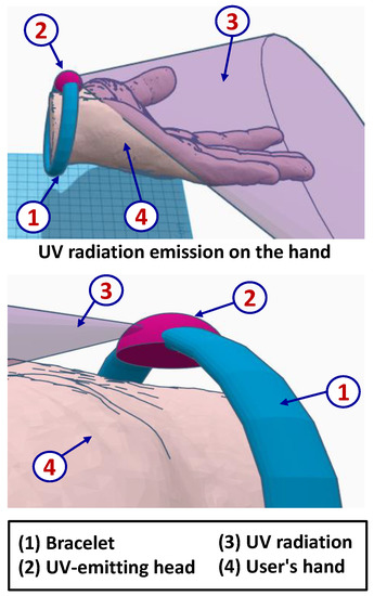 The concept of the proposed scheme is illustrated in Figure 1, Figure 2 and Figure 3. The device is a system for disinfecting hands and the objects they touch, as shown in Figure 1, and consists of a wristband that is placed around the wrist of the user’s hand. It is equipped with an intelligent electronic system that emits UV rays directly on the palm of the hand and the object in front of it.