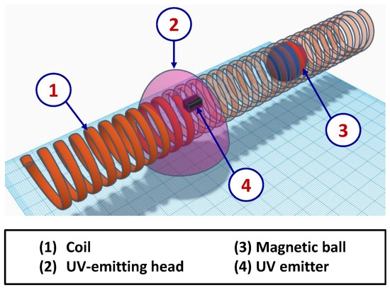 (i) Using the electrical energy generated by the movement of the user’s hands, the basic principle of which is illustrated in Figure 2. Indeed, when a magnetic ball placed inside the coil moves thanks to the movement of the hands (when the user rubs or slaps his hands), an induced current is generated in the circuit, which then charges a capacitor, which, in turn, discharges; this electrical voltage supplies the UV emitter to be emitted as UV radiation through the small UV lamp. The power can be increased by placing several adjacent coils. With this solution, the UV lamp will be directly supplied with the generated energy.