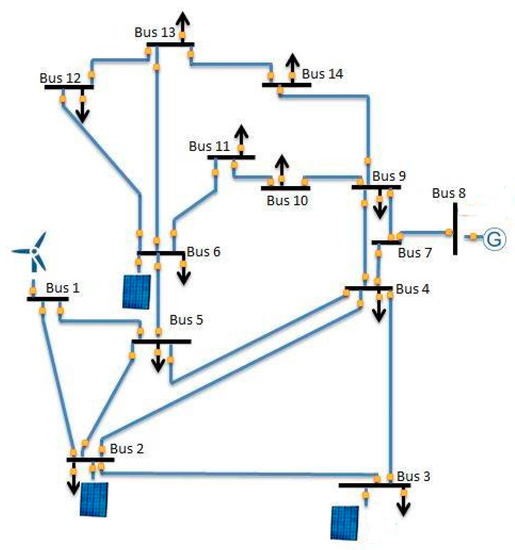 In this paper, selecting a 100% renewable power system was an objective to ensure the validity of controlling the pilot bus load voltage control from only renewable generators. The power system chosen shown in Figure 1 is the IEEE 14-Bus system after modifying the generation to be 100% renewable, as listed in Table 1. The modifications are made to enable the control of the pilot bus from inverter-based generation systems. In the proposed 14 bus system, unlike countries with high participation of renewable energies, it is assumed that the penetration level of inverter-based power plants is higher than that of the hydro. The assumption is performed based on the global trend towards increasing the installed capacity of photovoltaics and wind generation. Appendix A illustrates the lines and load data.