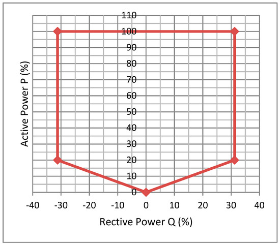 The grid connected inverters installed in photovoltaic power station should meet the requirement that their power factors could be dynamically adjusted within the range of 0.95 leading 0.95 lagging at the rated active power output, as shown in Figure 3. Solar codes in some countries require reactive power control within the above range even at zero active power output [24].