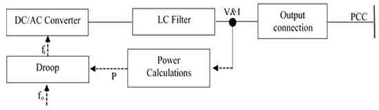 Figure 5 shows a frequency control system of inverters-based generators in power systems. The three blocks are power block, current block, and voltage block. The current and voltage blocks are classified as fast dynamics blocks, while power block concerns with power control ignoring fast dynamics of the other two blocks. The basic key in the power controller is the droop control, since the inertia is small in most wind turbines and negligible in PV modules so the primary frequency control is made mainly using the droop control. Equation (1) describes the power frequency control [25].