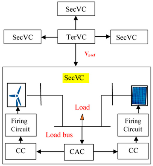 Figure 6 illustrates how voltage control hierarchy is applied based renewable power generators in the electrical network with SecVC configuration details. The execution time of each level is less than the higher one in order to avoid overlapping between the three levels. This application can be implemented by adapting the dominant time constant of the SecVC to be higher than that of all the PriVCs in the power grid and the TerVC is performed every half an hour or longer time interval [9]. The voltage control sequence is performed, as described by the following procedure: