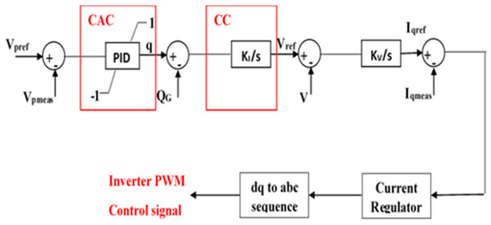 PriVC (firing angle control) controls the PCC voltage magnitude of the farm or the park, which is implemented by controlling automatically the on–off switching of the inverter through controlling Iqref reference current, as shown in (2). The time constant of the PriVC is normally short (≤0.5 s). The actual measured Iqmeas is compared with the reference Iqref, as shown in (3), and the error (ΔIq) is the input of the current regulator, which by its role will control Vd and Vq leading to the change of the firing angle of the inverter.