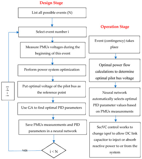 The idea in this paper is that in high penetration level of renewables, the renewable power plants should support the voltage of loads at PQ buses in case of contingencies. In this research, we consider a 100% renewable 14-bus system with a very high penetration level of wind and photovoltaic generation, as shown in Figure 1. The voltage control strategy explained in Figure 8 includes two stages: the design stage, which is basically made to enable the grid to optimally behave during any operation stage through optimization process and artificial intelligence. During the operation stage, the system will be able to detect its entire case the optimal values of this case (certain contingency) and the controllers should work properly to reach those optimal values. The design stage flow chart shows that at different conditions of the power system optimal values change. In this study a renewable plant outage will be assumed, and the power system optimization process will take place in order to minimize the total power loss taking into considerations voltages, active, reactive power limits. The optimization will be performed using the DIgSILENT power factory software.
