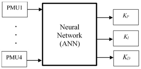 The secondary voltage control scheme, which is shown in Figure 7, includes parameters that are driven from the power system directly except the coordinated PID controller parameters, which is designed to track the reference value of the pilot load bus at a time range longer than that of the PriVC. The 100% renewable power network is subjected to different large disturbance, such as the outage of part of a renewable power plant or an outage of a transmission line. In each disturbance, the optimal parameters of the coordinated PID controller will differ due to the change of the power system configuration at each operating condition; moreover, the pilot bus voltage reference will change based on TerVC at each operating case. To solve this problem, an artificial intelligence element is used. The element is chosen to be the neural network to work based on what-if analysis such that it will be able to optimally tune the coordinated PID based on the operating condition. The neural network will select optimal PID controller parameters according to the operating condition that is determined by PMUs readings as shown in Figure 9.