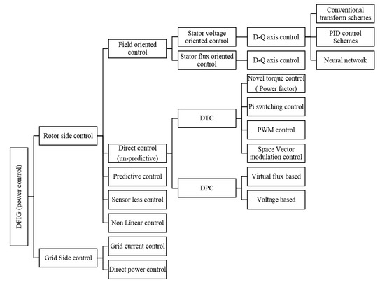 In the literature review, two main control strategies are adopted to achieve optimal power stabilization of the DFIG, i.e., the vector control (VC) and direct torque control (DTC), to augment the machine realization [4]. DTC is a non-linear type of control that functions in a hysteresis style. It detects the nonlinear parameters of machines such as flux and torque, and adjusts the rotor voltage to a suitable power [3,10,17,18]. Another scheme for linear control, named vector control (VC), depends on simple single input, single output feedback type regulators, i.e., PI and PID controllers, or a more progressive state space concept. This approach leads to the conversion of a complex moveable rotating frame into an equivalent orthogonal two-dimensional stationary DQ frame [19,20,21,22,23]. So, to make the parameter approximation simpler, this work is categorized in vector control schemes. A summarized chart for the control schemes discussed in the literature review is shown in Figure 1.