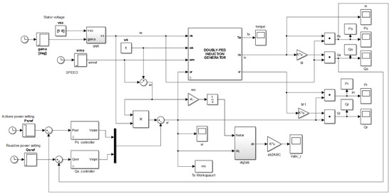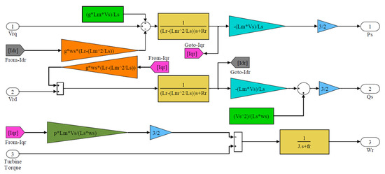 Figure 7 represents the implantation of a simplified mathematical model of DFIG in the MATLAB Simulink tool, taking into account the synchronized d–q reference frame. This model represents the total system components (parameters) needed to run the simulation. The transfer function block diagram for DFIG is shown in Figure 8.