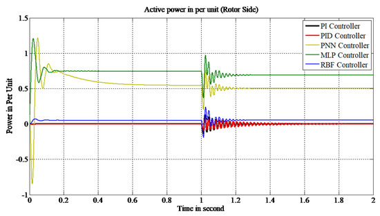 From Table 2, it can be observed that the overshoot value with a conventional control scheme is 0.378 p.u., while for PID it is 0.260 p.u., and it is highest with PNN and MLP controllers with overshoot values of 3 and −1.2 p.u., respectively. It is lowest with the RBF-based power controller, with a value of 0.38 p.u. For settling time, PI and PID took more than 1.9 and 2 s, respectively, while PNN took 1.38 s to settle. The RBF- and MLP-based power controllers have settling times of 1.36 and 1.33 s, respectively. So, with these observations, the above table clearly suggests the RBF-based power controller as an effective controller for active power control at the stator side, with a lower settling time, a lower rise time and a reduced overshoot value.