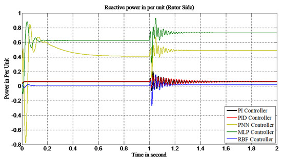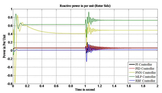 It can be observed from Table 5 that the overshoot value of the conventional control scheme is 0.19 p.u., and with PID it is 0.15 p.u., while with PNN and MLP the values are 0.86 and 0.93 p.u., respectively. With the RBF-based power controller this value is 0.15 p.u. The overshoot values for the RBF and PID controllers are the same, and are lower than all other controllers. However, the RBF-based controller also possesses lower settling and rising times than all other controllers. As such, with the above observation it can be clearly stated that the RBF-based power controller offers robust control of the reactive power at the rotor side.