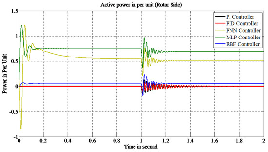 The response of the DFIG generator with PI, PID, PFFNN, MPLFFNN and RBFFNN controllers at prescribed gains and the above-mentioned assumptions, along with certain parameters and a stator side active power controller, is shown in Figure 9.