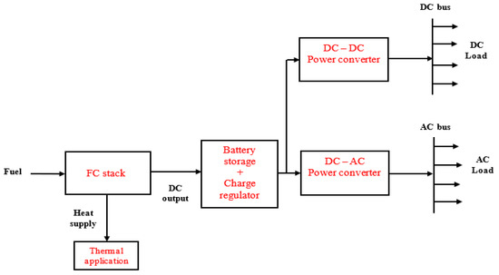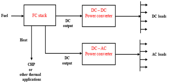 The application of microgrid technologies in electrical systems may be classified as grid-integrated and grid-independent systems. Whether the FC technologies are employed for grid-connected or off-grid purposes, it is necessary to establish the fact that an FC power plant is more the FC stack. This is due to the constant supply of reactants, i.e., fuel and oxidant, that is critical for achieving continuous production of electrical power [36]. Therefore, the nexus between FC stack and microgrid is of interest in this subsection. The fuel and the oxidant, for instance, need to meet a certain predetermined level of impurity before being employed to operate the FCs. As a result, the FC power plant is structured containing some components such as fuel processing, oxidant conditioning, electrolyte management, and heat energy management units, including the one employed for reaction product removal, etc. These components were illustrated and detailed with a schematic in [36], but the FC microgrid in this current paper is based on Figure 2, which is used for the purpose of illustration in line with fundamental electrical principles. Figure 2 illustrates the additional subsystems required for processing the energy from the FC stack to the users. The FC microgrids are capable of producing electrical power from as low as <1 W to hundreds of kW [111].