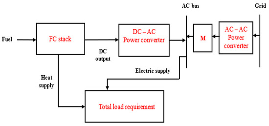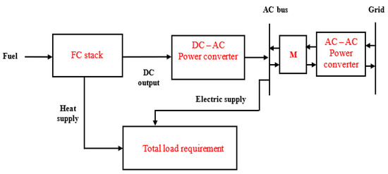FC systems may be employed for on-grid and off-grid purposes in situations where the microgrid system is co-located with the load. Suppose that energy supply is being provided mainly by the FC stack, as shown in Figure 3. Then the microgrid can potentially compete with or serve as an alternative to the grid supply or provide electricity for grid-independent applications in isolated communities. Furthermore, operating the FC microgrid in parallel with the existing grid could provide the opportunity for meeting peak load or baseload requirements since continuous energy generation is a property of the energy source.