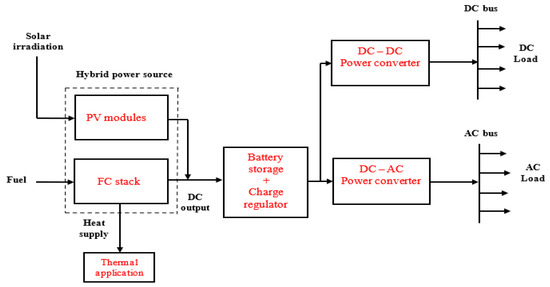 In this application, there is no interaction between the users’ load and the grid, unlike the grid-tied and grid-parallel modes, nor is there any electrical connection between the FC microgrid system and the existing power grid [124]. Therefore, energy flow is only available from the on-site power system to the load. The on-site power system could be a single-source, stand-alone power system that is entirely based on FC technology or a hybrid system that is based on the combination of FCs and other technologies like solar PV, biomass, battery, diesel generator, microturbines, etc. A conceptual remote hybrid electrification system was described in [125]. However, this paper designed Figure 5, Figure 6 and Figure 7 for illustrating different configurations of FC-based, stand-alone power systems.