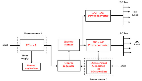 Figure 5 shows a single-source system based on FCs, while Figure 6 and Figure 7 illustrate hybrid systems of FCs + PV and FCs + diesel generator. A microturbine generator may also be used instead of diesel generator in Figure 7, which implies that power sources 1 and 2 could be served from a single primary fuel—natural gas. Furthermore, a “load-following” approach is usually employed in stand-alone power systems, which is why battery storage is integrated with the energy generation arrangement to respond to rapid variations in users’ load demand at some point in the system operation [111,126].