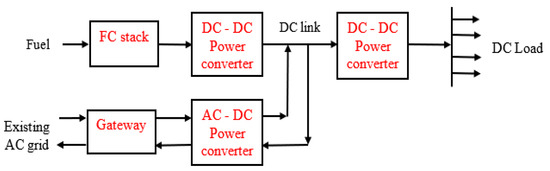 The DC generated by the FC stack may be used to power DC appliances, without the need for an inverter, or employed for developing a direct current (DC) microgrid. Figure 8 illustrates the DC microgrid with a connection with the existing power grid [68]. The DC microgrid is composed of a DC voltage source, i.e., an FC stack, which is connected to the source DC-DC converter for achieving a higher or lower voltage output depending on the design requirements. A load DC-DC converter is required, as shown in Figure 8, for interfacing the load with the DC bus, which is used to bring the bus voltage to the value required by the load or appliance. The common voltage levels that have been employed for telecom systems are 24 V and 48 V [68,128,129]. It is necessary to provide an interface between the existing power grid and the DC microgrid; this is achieved by using the bidirectional AC-DC converter [130]. Through this it is possible to sell back the excess electricity from the DC microgrid to the existing power grid, as well as purchase energy from the power grid when the output of the microgrid system is lower than the load demand [131]. The gateway unit requires an AC power input as it is meant to provide a bidirectional link between the microgrid and the existing grid or other generation sources in the arrangement.