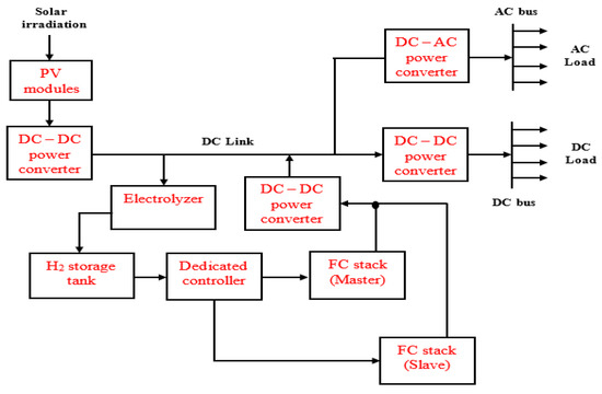 The stand-alone power has to have the technical capability to satisfy the start-up requirements of inductive loads such as water pumps, motors, and fans, for instance. This implies that the FC microgrid (FCs + battery storage) must be modeled to meet maximum continuous load demand for reliability purposes. In the system presented in Figure 5, the FC stack can provide the charging current for the battery bank at times when there is low energy demand by the users. However, the users will experience loss of energy supply if the FC stack is faulty or not available to supply power. This problem may be addressed by using the complementary characteristics of the hybrid systems, shown in Figure 6 and Figure 7, as the users will benefit from the hybrid energy generation resources. In this case, some form of energy management strategy is integrated with the power electronic converters to control the energy interchange between the power sources and the battery storage system.