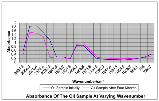 Figure 3 shows absorbance spectra from the oil samples initially and at the end of four months that are superimposed on a common spectral grid. In the FTIR analysis, the ratio of the intensities (or areas) of peaks above 3000 cm