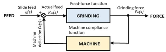 A general grinding system can be represented as a closed-loop system, as shown in Figure 1. The system is composed of two functions. One is the feed-force function based on the grinding mechanism, and the other is the compliance function of the grinding machine. In a grinding machine, an infeed slide with a grinding wheel head is fed into the workpiece and an amount of interference between the wheel and the workpiece is specified. The grinding wheel removes materials from the workpiece as per the actual interference amount. The grinding and subsequent material removal result in the generation of grinding forces and cause the deflection of the machine structures in the infeed direction. Therefore, the actual amount of the interference becomes the difference between the command infeed and the machine deflection. This principle can be applied to most grinding systems, including surface grinding, cylindrical grinding, centerless grinding, shoe-centerless grinding, double disk grinding, etc.