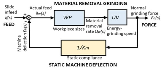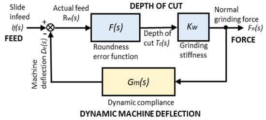 The deflection given by Equation (14) is fed back to Equation (9). Thus, the infeed cylindrical grinding processes can be described as a closed-loop system repeating Equations (9)–(14).
