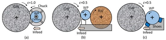 Cylindrical grinding methods (WP: workpiece, GW: grinding wheel, RW: regulating wheel). (a) Center-chuck type grinding c = 1.0; (b) Centerless grinding c = 0.5; (c) Shoe centerless grinding c = 0.5.