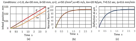 Simulations of the changing processes of , and during the infeed grinding with a constant rate are shown in Figure 10a–c.