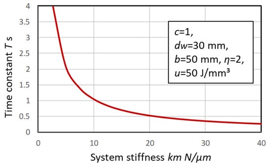 Figure 12 presents the relationship between the system stiffness km and the time constant T. As Equation (16) indicates, the higher the system stiffness, the shorter the time constant. The design with the more rigid grinding machine provides a shorter time constant T and reduces the spark-out time.