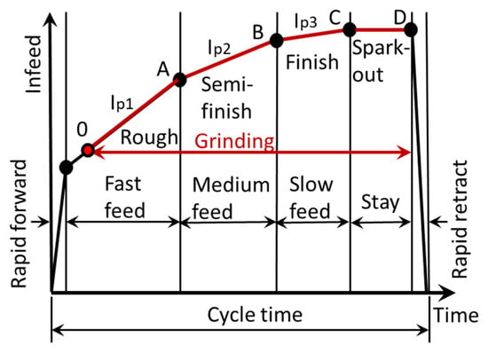 It is critical for infeed grinding operations to determine the infeed positions O to D; the infeed rates and spark-out time based on the hard stock conditions; and the requirements for productivity. To design the grinding cycle, the following parameters should be considered and be quantitatively analyzed during the infeed grinding processes.