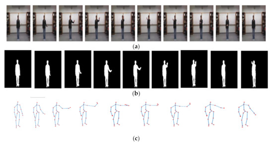 Different modality of an action: (a) RGB, (b) depth(silhouette), and (c) skeleton representations.