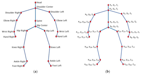 We unify the twenty joints by numbering in each frame, as shown in Figure 2. First, we number the twenty joints (head, houlder_center, spine, hip_center, left_center, left_elbow, left_wrist, left_hand, right_shoulder, right_elbow, right_wrist, right_hand, left_hip, left_knee, left_ankle, left_foot, right_hip, right_knee, right_ankle, right_foot) with separate variables (, , , , , , , , , , , , , , , ,, , , ), respectively, in each frame shown in Figure 2. The same sequences for numbering are also assumed for both Y and Z axes respectively. When we analyze joints information along the X, Y, and Z axes, we observe that there is an inevitable variation among joints positions when actions are performed using different parts of our bodies.