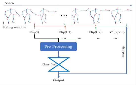 The overall architecture of the proposed system is shown in Figure 3. There are two basic parts in the proposed method: (1) pre-processing and (2) classification. We design a simple DCNN model and also conduct ResNet18 and MobileNetV2 for further evaluations and comparisons. The interpretation of the preprocessing referred to previously in Section 3.2 comprises the processing of skeleton data and the preparation of training and testing datasets.