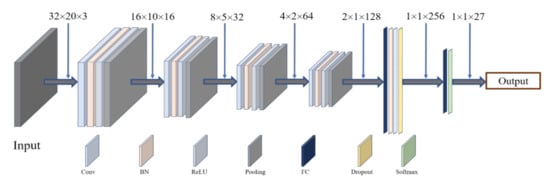 In Figure 3, the clip at time t is first passed through the preprocessor, and then the preprocessed input is sent to the classifier for discriminating among the classes. This process continues until the input is finished. There are six main blocks in the classifier networks, as shown in Figure 4. The first layer is the input layer. The next four blocks include convolutions, batch normalizations, and ReLU, followed by max-pooling layers. The fifth block is integrated with a fully connected layer, batch normalization, ReLU, and dropout. The final block consists of a fully connected layer and a softmax layer that produces classification output.