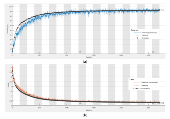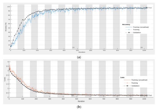 Training results of UTD-MHAD dataset: (a) accuracy and (b) loss.
