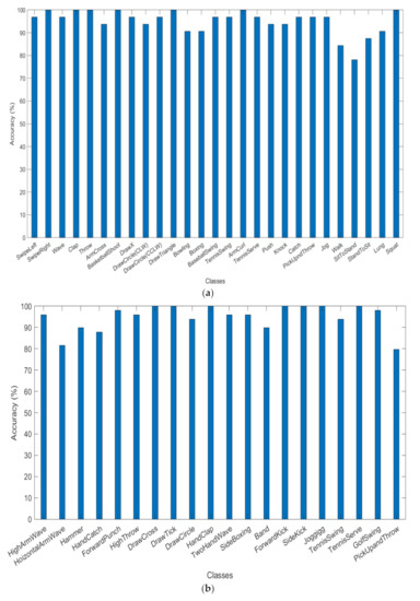 To examine the classification accuracy of each class, we used a bar chart to visualize the classification accuracy versus class names. The individual class results are shown in Figure 7a,b for UTD-MHAD and MSR-Action3D datasets, respectively.
