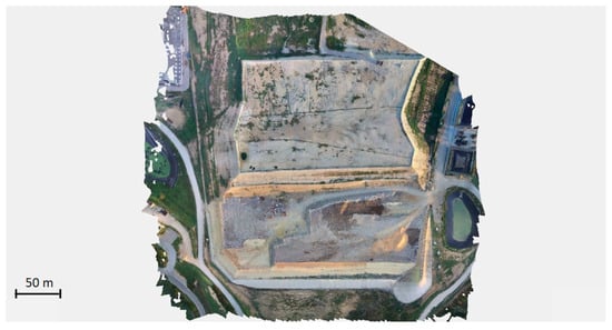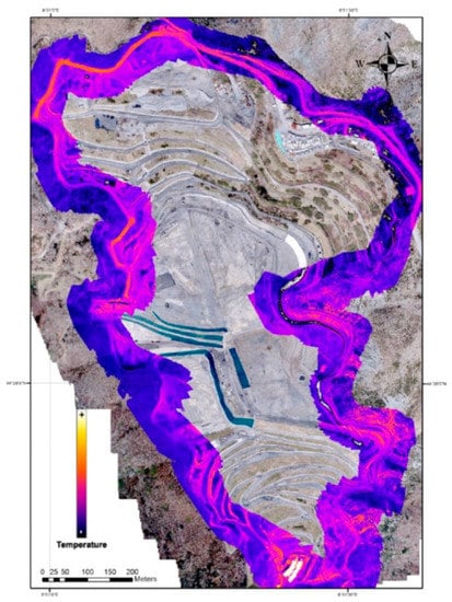 An aerial view of Scala Erre landfill is shown in Figure 2. The inspection of the site was performed using a FLIR Duo Pro R (FLIR Systems, Inc., Wilsonville, OR, USA) camera mounted on a DJI Inspire 2 (SZ DJI Technology Co., Ltd., Shenzhen, China) drone. The sensor contains two cameras (a 640 × 512 pixels IR camera, temperature sensitivity: 50 mK, and a 4000 × 3000 pixels RGB camera), synchronized between them and connected to GNSS (Global Navigation Satellite System) positioning. The flights were performed at 70 m above ground level, following an automatic planned path of 18 parallel flight lines. During a typical survey, about 1500 RGB/IR images were acquired and processed; the superposition of nearby images, both along and across flight lines, was above 70%; the ground resolution of IR images was about 6 cm/pixel.